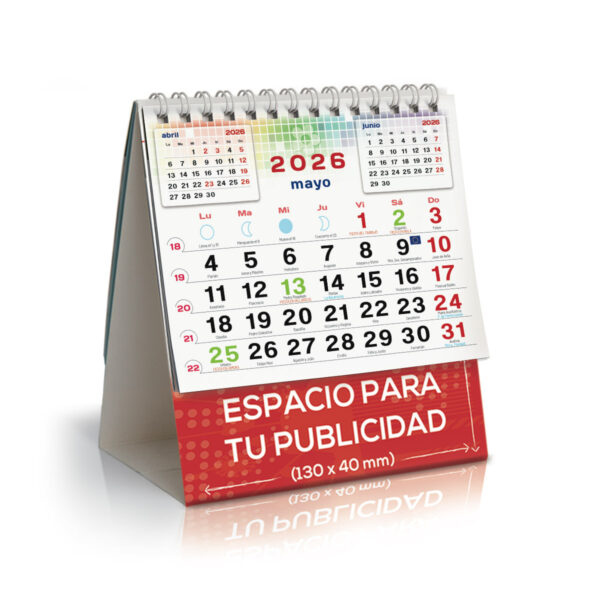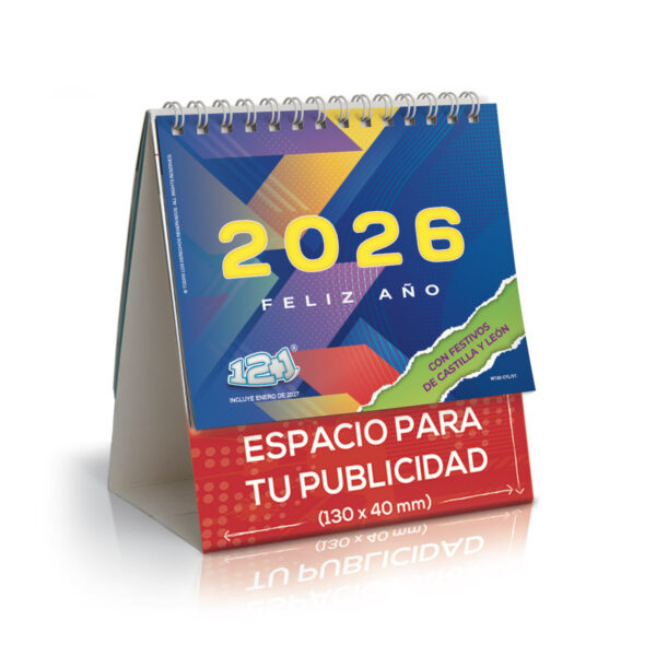 Este práctico calendario ocupa poco espacio pero tiene unos número claros y muy legibles. Tiene marcadas las fiestas comunes del territorio nacional y las propias de Castilla y León con sus capitales de provincia. Peana impresa a 4/0 tintas (todo color) en cartulina gráfica de 360 grs., impresas con el año en curso y el siguiente.