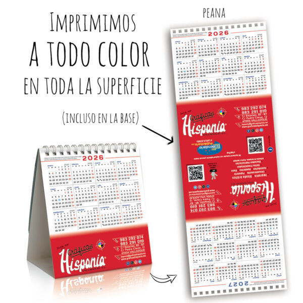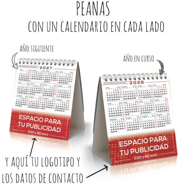Peana impresa a 4/0 tintas (todo color) en cartulina gráfica de 360 grs., impresas con el año en curso y el siguiente. (Se recomienda plastificado).