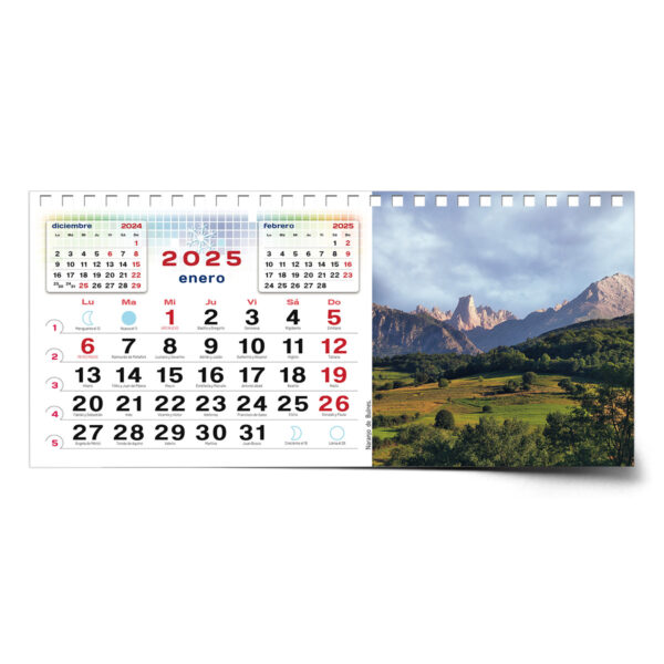 Con preciosas vistas del principado de Asturias. Los números son grandes, claros y muy legibles. Están marcadas las fiestas nacionales y autonómicas, santoral, fases lunares, inicio de las estaciones y los cambios de horario.
