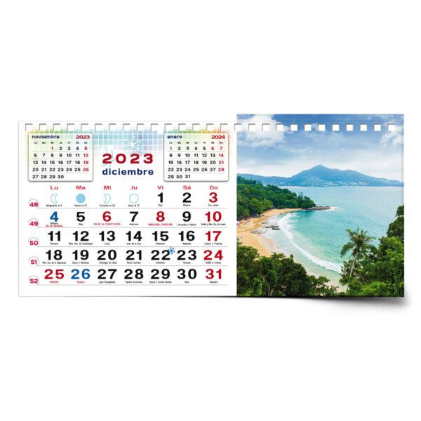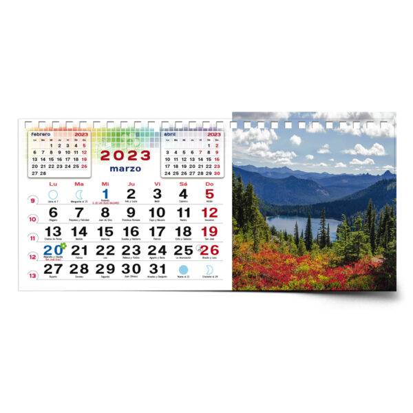 Con magníficas vistas de paisajes de todos los lugares del mundo. Los números son grandes, claros y muy legibles. Están marcadas las fiestas nacionales y autonómicas, santoral, fases lunares, inicio de las estaciones y los cambios de horario.